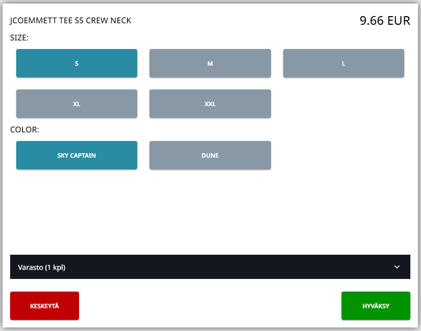Jos kassalla luetaan variantin SKU tai viivakoodi, lisätään variantti suoraan ostoskoriin. Näet variantin ominaisuudet ostoskorista nimen perässä.