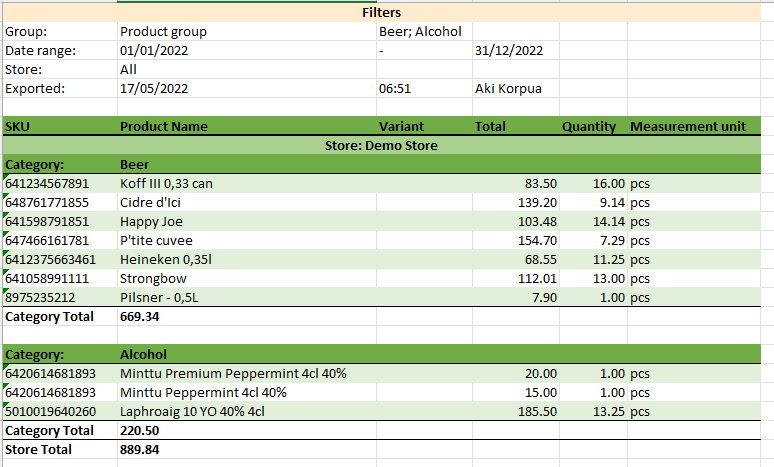 | Ryhmitelty myyntiraportti tai kassalla tehtävä myyntiraportti. |