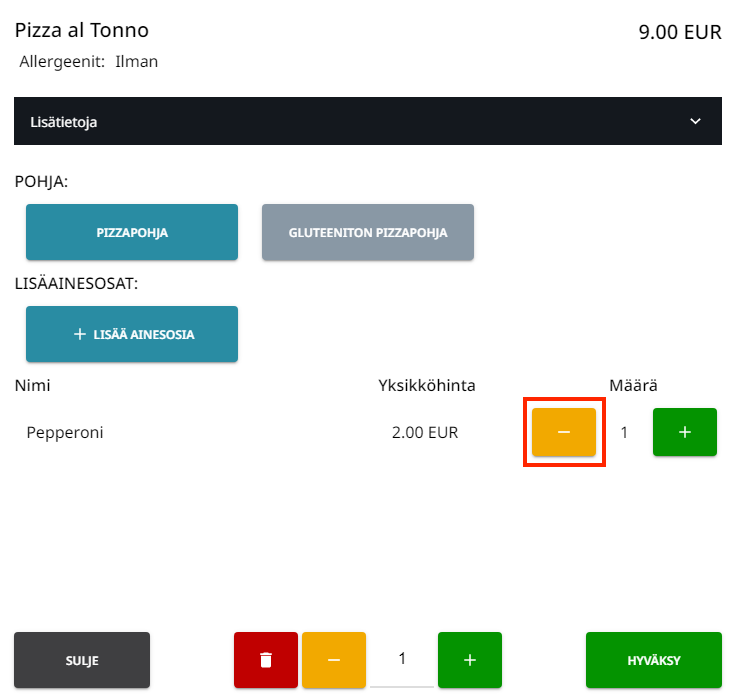 Lisäainesosat joita asiakas ei haluakaan voidaan poistaa klikkaamalla tuoteriviä ja poistamalla ne tuotekortilta.