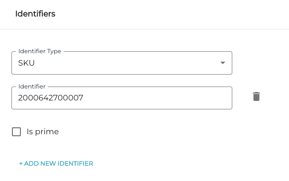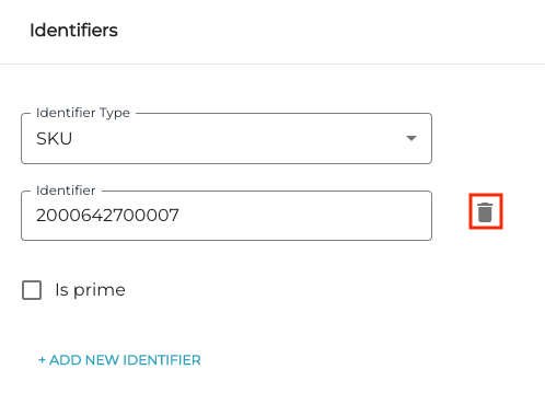 Klikkaa myyntituotteen/ainesosan Tunnisteet-tiedoissa kohdassa SKU roskakorikuvaketta.