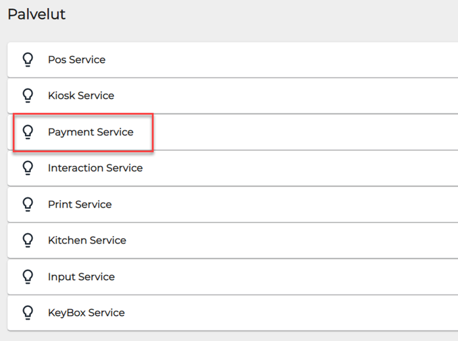 Avaa Palvelut-kohdasta Payment Service-asetukset klikkaamalla kyseistä riviä.
