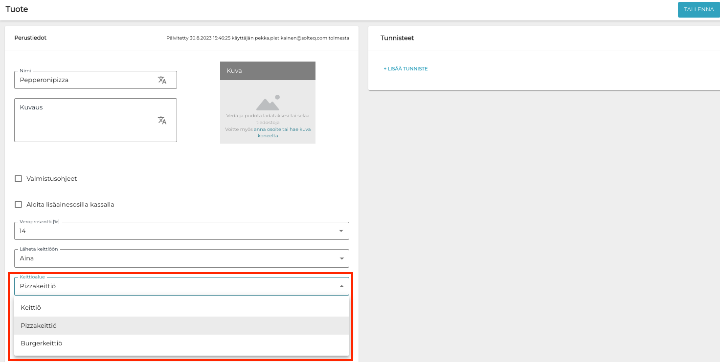 Tuotetiedoissa valittu keittiöalue määrittää sen, mille keittiöalueelle tuote lähetetään, jos kyseinen keittiöalue on luotu kyseisen myymälän asetuksiin.