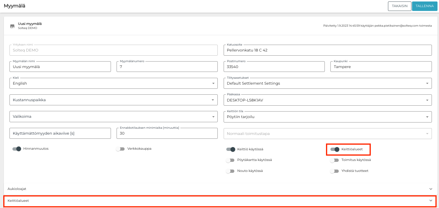 Klikkaa myymälän asetuksissa Keittiöalueet-kytkin päälle ottaaksesi keittiöalueet käyttöön.