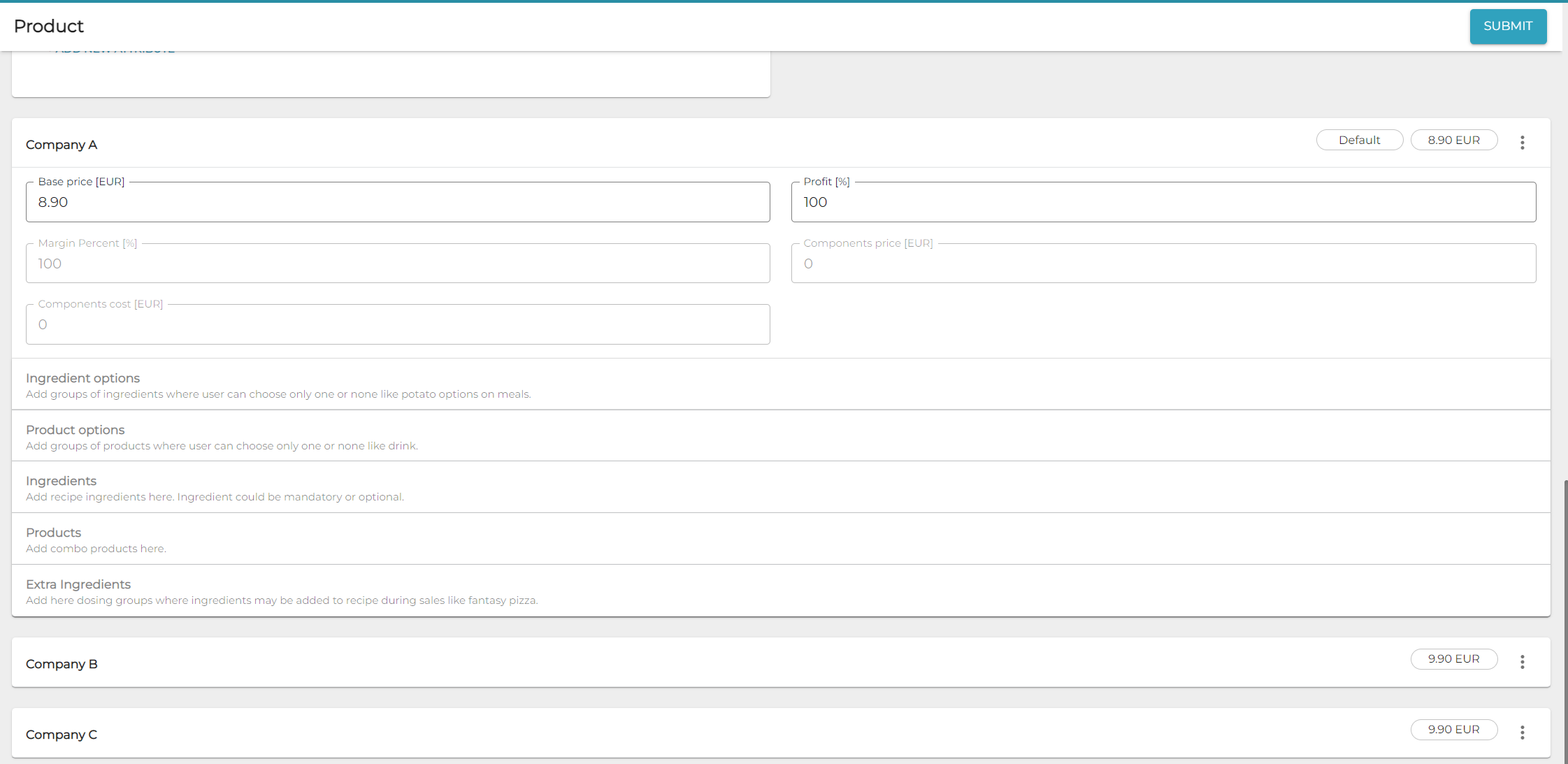 Perusta uusi reseptituote (nimeltään esimerkiksi Sopimuslounas). Luo sille eri koot omine hintoineen jokaista yritystä kohden, jolle sopimuslounasetu halutaan antaa.