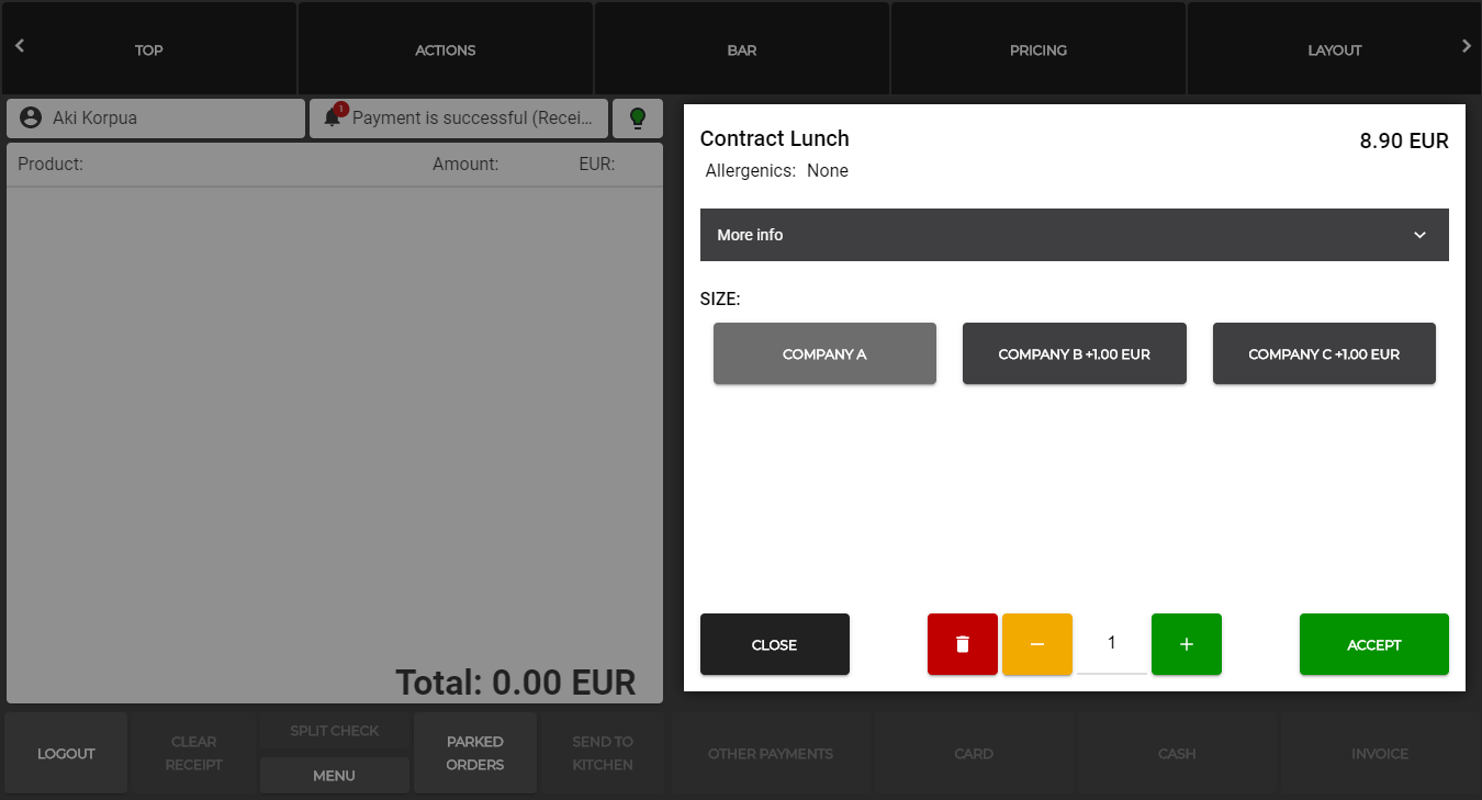 Kun asiakas tunnistetaan kassalla, Sopimuslounas-tuote voidaan lisätä ostoskoriin, jolloin myyjä valitsee oikean koon (=yrityksen) sille.