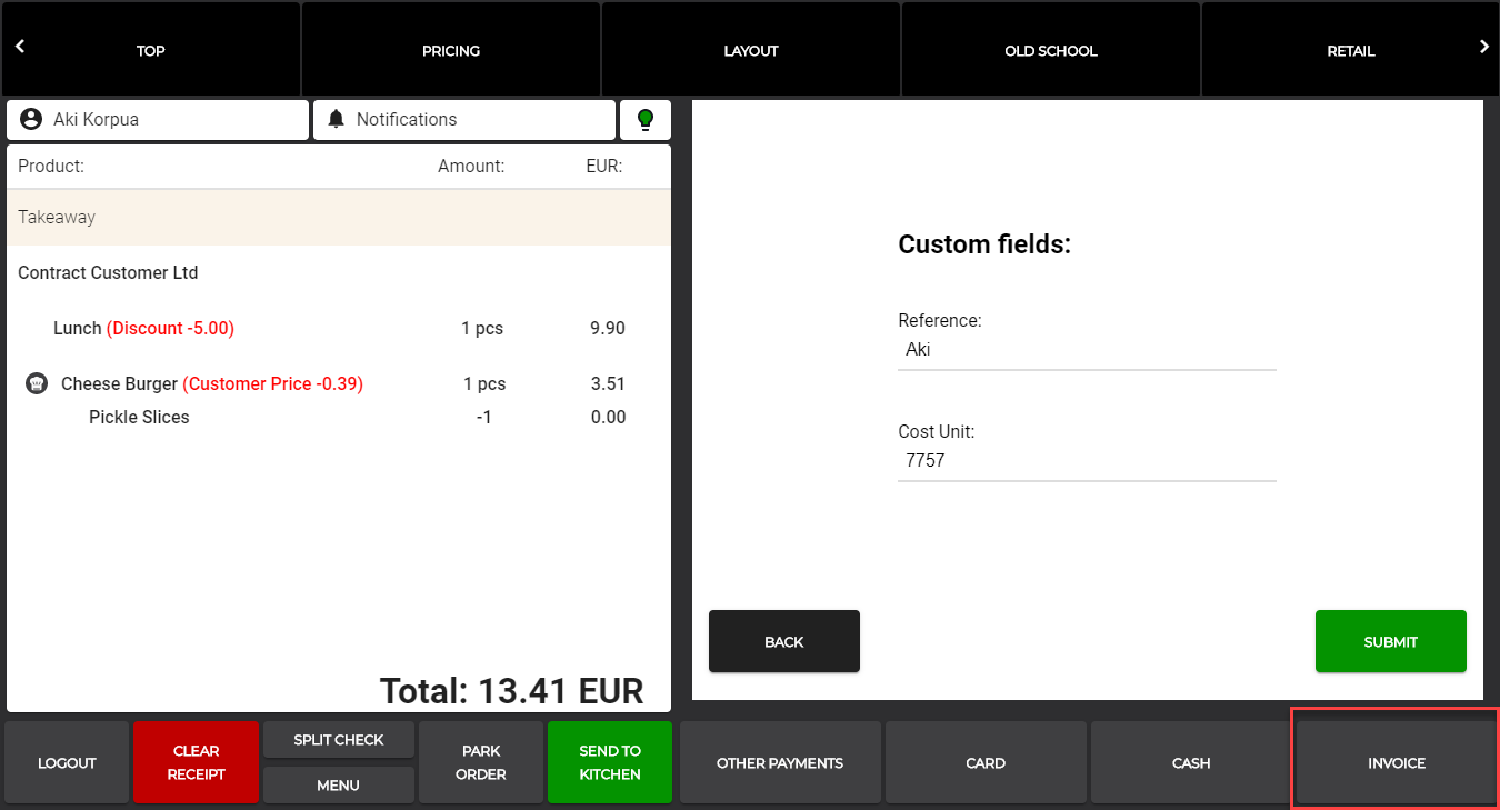 Samoja aterioita voidaan myös lisätä manuaalisesti ostoskoriin, valitsemalla Sisäinen laskutus -maksutapa, hakemalla asiakastiedot, ja sitten valitsemalla oikea tuote kassalla.