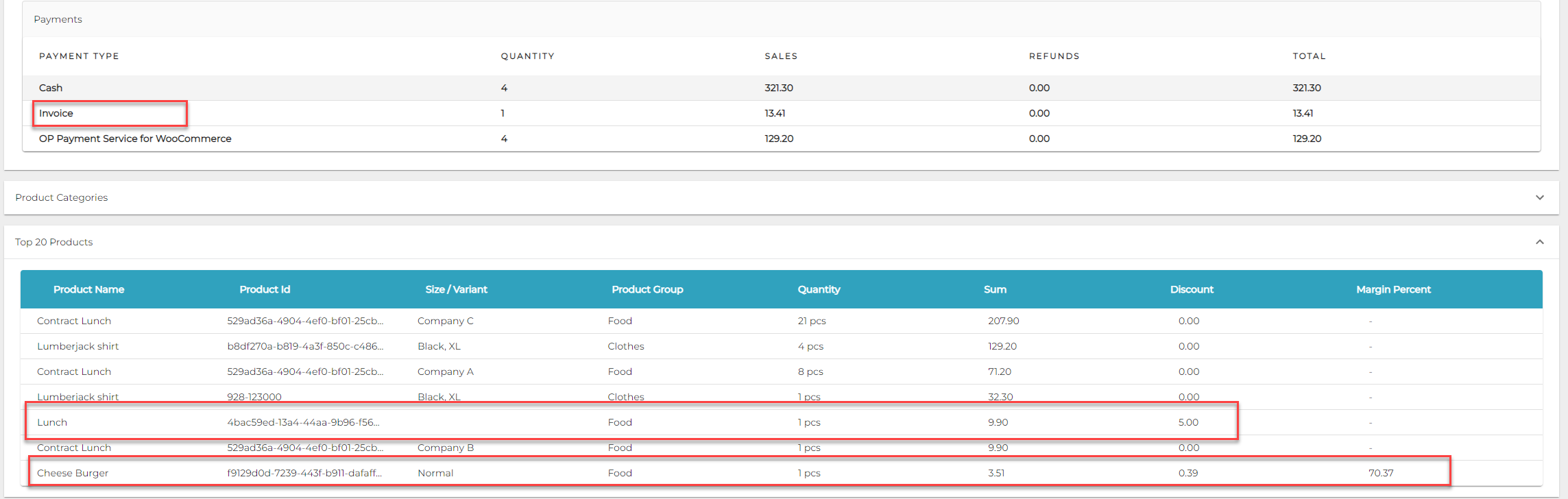 Taustapalvelun Tilastot-näkymässä voit tarkastella myyntiä, joka on tehty Laskutus-maksutapaa käyttäen, sekä tuotteita/alennuksia joissa tätä vaihtoehtoa on käytetty.