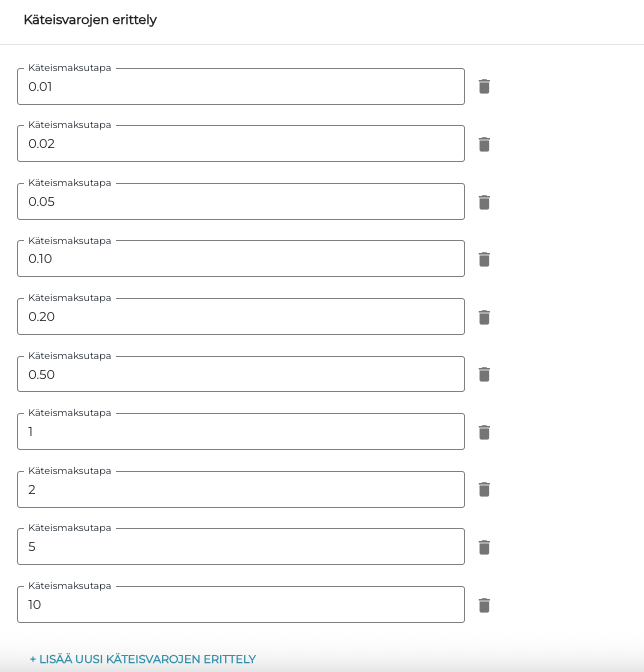 Voit tarvittaessa lisätä päävaluutalle ns. käteisvarojen erittelyn, jota käytetään kassalla tilityksien tekemisessä.