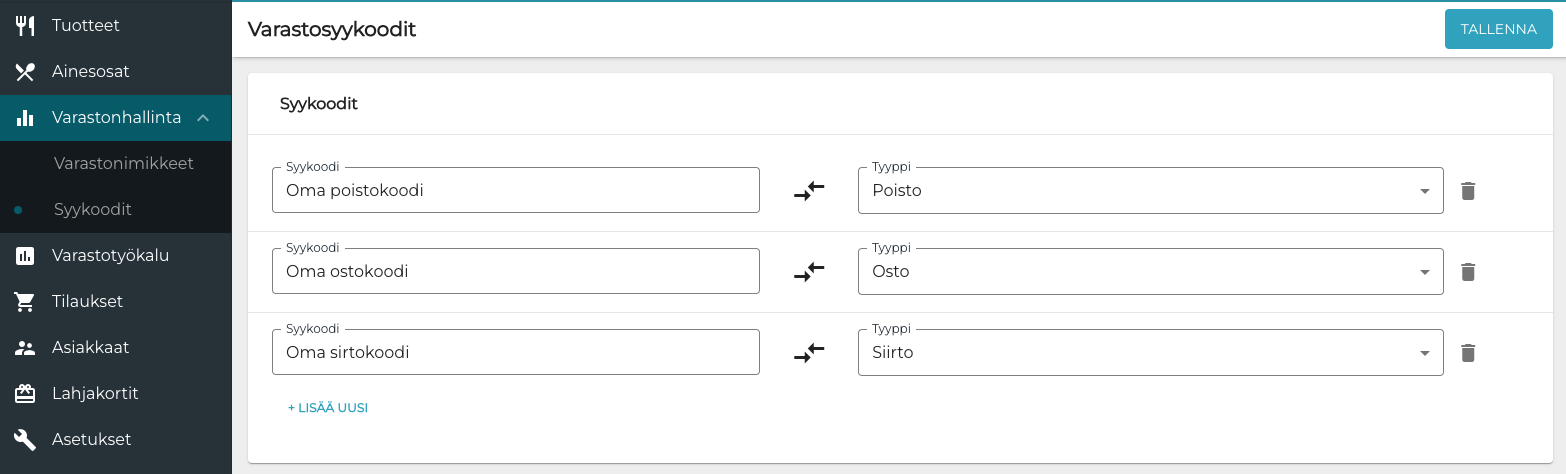 Varastosyykoodeja ei voi muokata sen jälkeen kun ne on luotu; jos teit virheen syykoodia luodessasi, poista koodi klikkaamalla roska-astia-kuvaketta, ja luo uusi syykoodi oikeilla tiedoilla varustettuna.