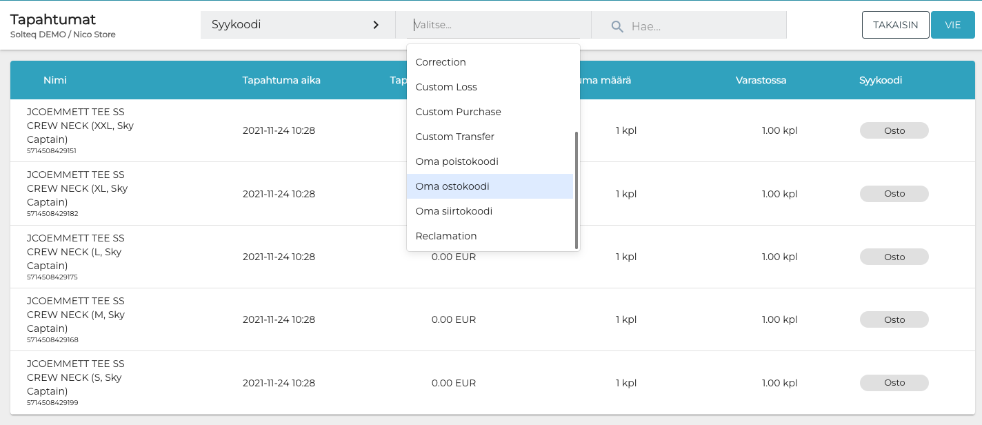 Varastotapahtumien suodattaminen syykoodin perusteella