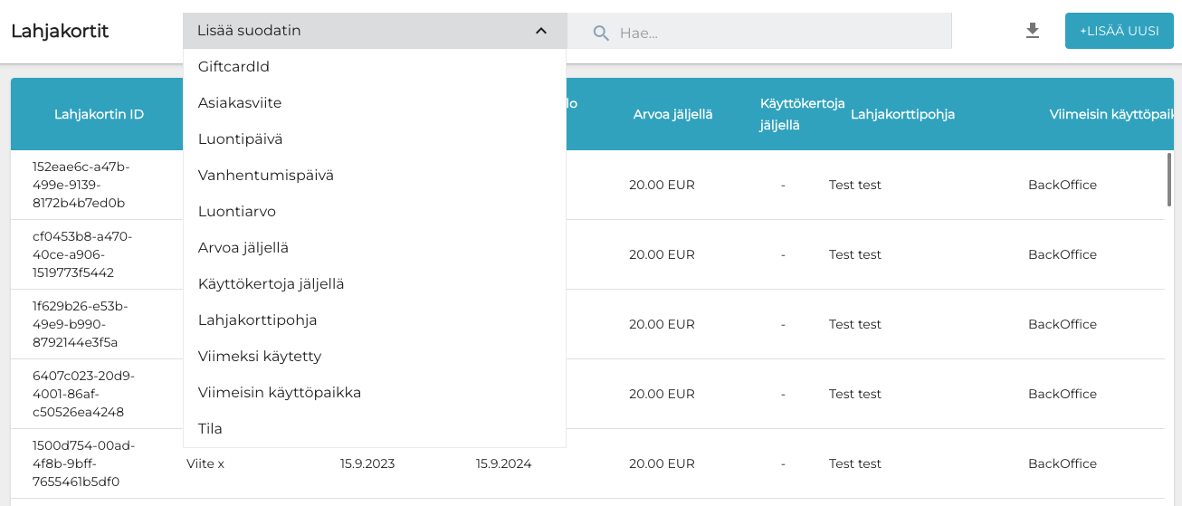 Hae lahjakortti Hae… -toiminnolla tai käytä Lisää suodatin -valikkoa suodattaaksesi listan näyttämiä tuloksia.