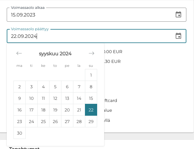 Valitse lahjakortille uusi Voimassaolo päättyy -päivä kalenterivalikosta.