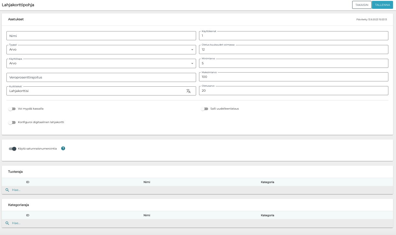 Määrittele tällä asetuksella oletusarvo lahjakorteille, jotka luodaan kyseistä lahjakorttipohjaa hyödyntäen.