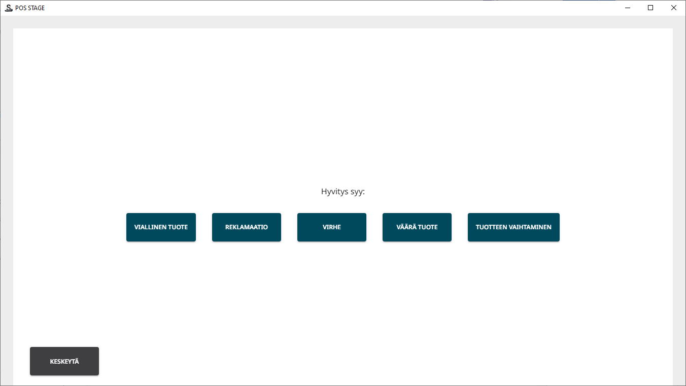 Lisää hyvitettävät tuotteet ostoskoriin joko tuotehaun, skannerin tai kassapainikkeen kautta. Hyvitystilassa tuotteiden hinnat ovat automaattisesti negatiivisia.