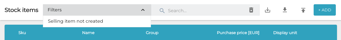 1. (valinnainen) Voit rajata varastonimikkeiden listaa Varastonimikkeet-näkymässä syöttämällä hakutermin Hae… -kenttään, tai valitsemalla Myyntituotetta ei ole luotu -suodattimen Lisää suodatin -valikosta, ja sitten klikkaamalla Suodata-painiketta. Varastonimikelista päivittyy valintojesi mukaisesti.