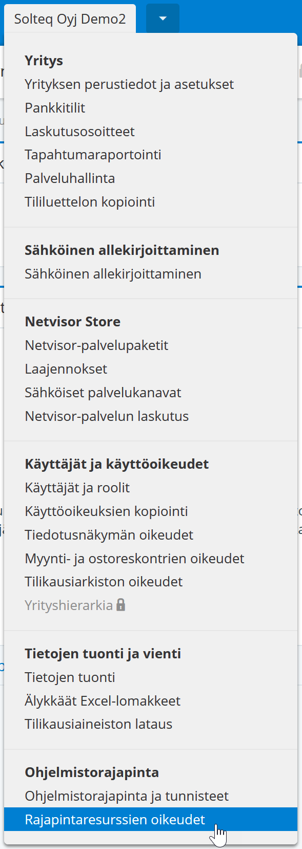 Avaa Netvisorissa päävalikko ja klikkaa Rajapintaresurssien oikeudet.