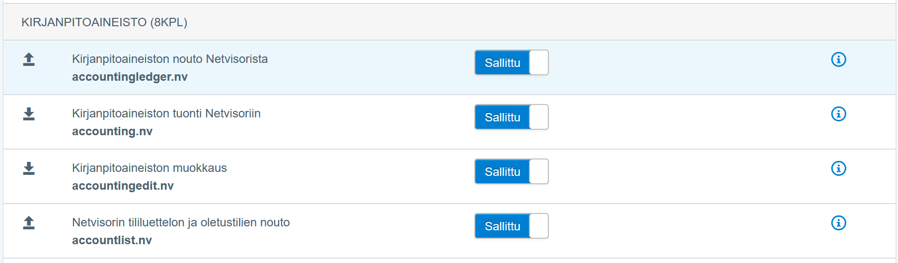 Valitse kyseinen integraatio ja anna sille pääsy tarvittaviin resursseihin; tarvittavat resurssit riippuvat siitä, mitä ominaisuuksia haluat laittaa päälle Netvisor-lisäosan asennuksessa:
