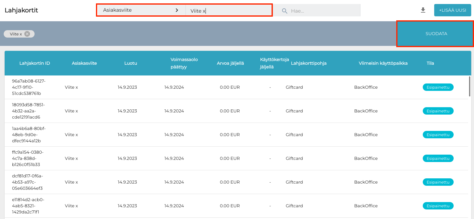 Valitse Lahjakortit-näkymässä suodattimeksi Asiakasviite, syötä lahjakorttierän nimi Asiakasviite-kenttään, ja klikkaa Suodata.