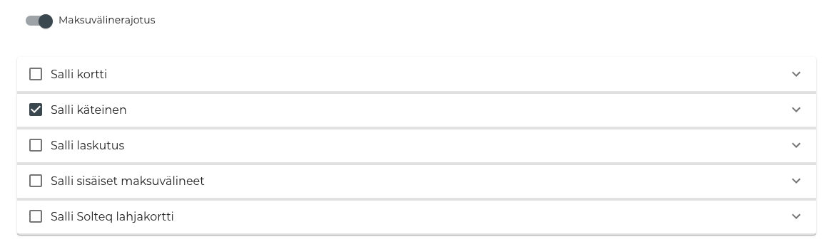 Tällä asetuksella voidaan säädellä, millä maksutavoilla tuote voidaan maksaa. Mikäli kytkin on pois päältä, tuotteelle käyvät kaikki kassalla käytössä olevat maksutavat.