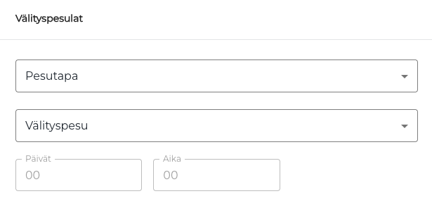 Nämä asetukset ovat määritettävissä tuotteelle ainoastaan, mikäli Välityspesulat-asetus on päällä yritystason asetuksissa, ja Välityspesukoodit sekä Pesutapakoodit on luotu taustapalvelussa.