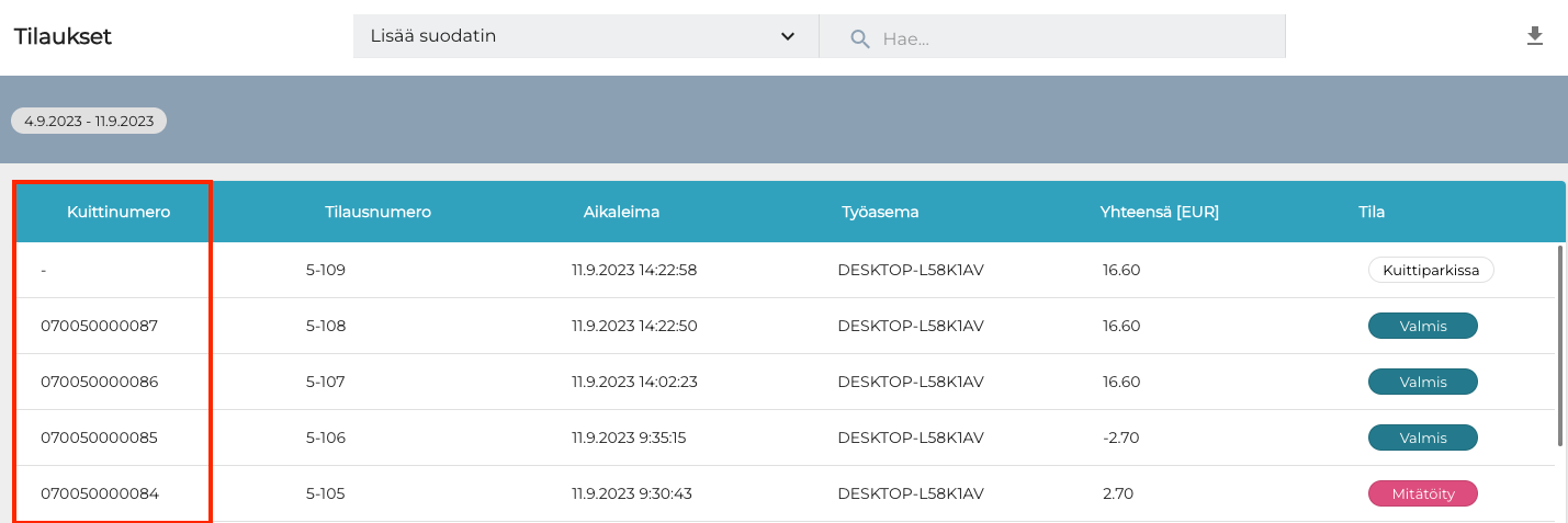 Kuittinumero-sarake Tilaukset-näkymässä