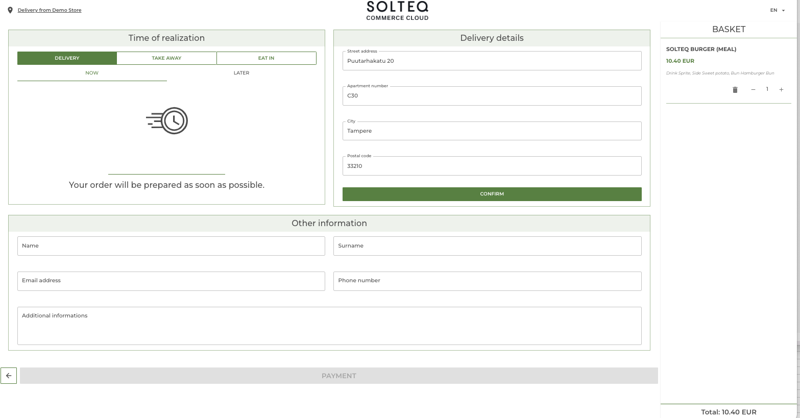 Maksaminen on nyt erotettu verkkokaupassa omaksi sivukseen, joka tulee näkyviin kun asiakas on valinnut toimitus/nouto/syö ravintolassa -vaihtoehdoista. Alla esimerkkejä uusista näkymistä.