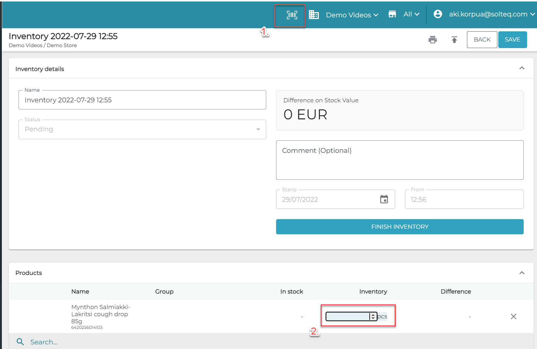 Mikäli SKU löytyy inventaariosta/ostotilauksesta, sen lukumäärä tulee näkyviin. Käyttäjä voi vaihtaa lukumäärää (kuvassa kohta 2.)