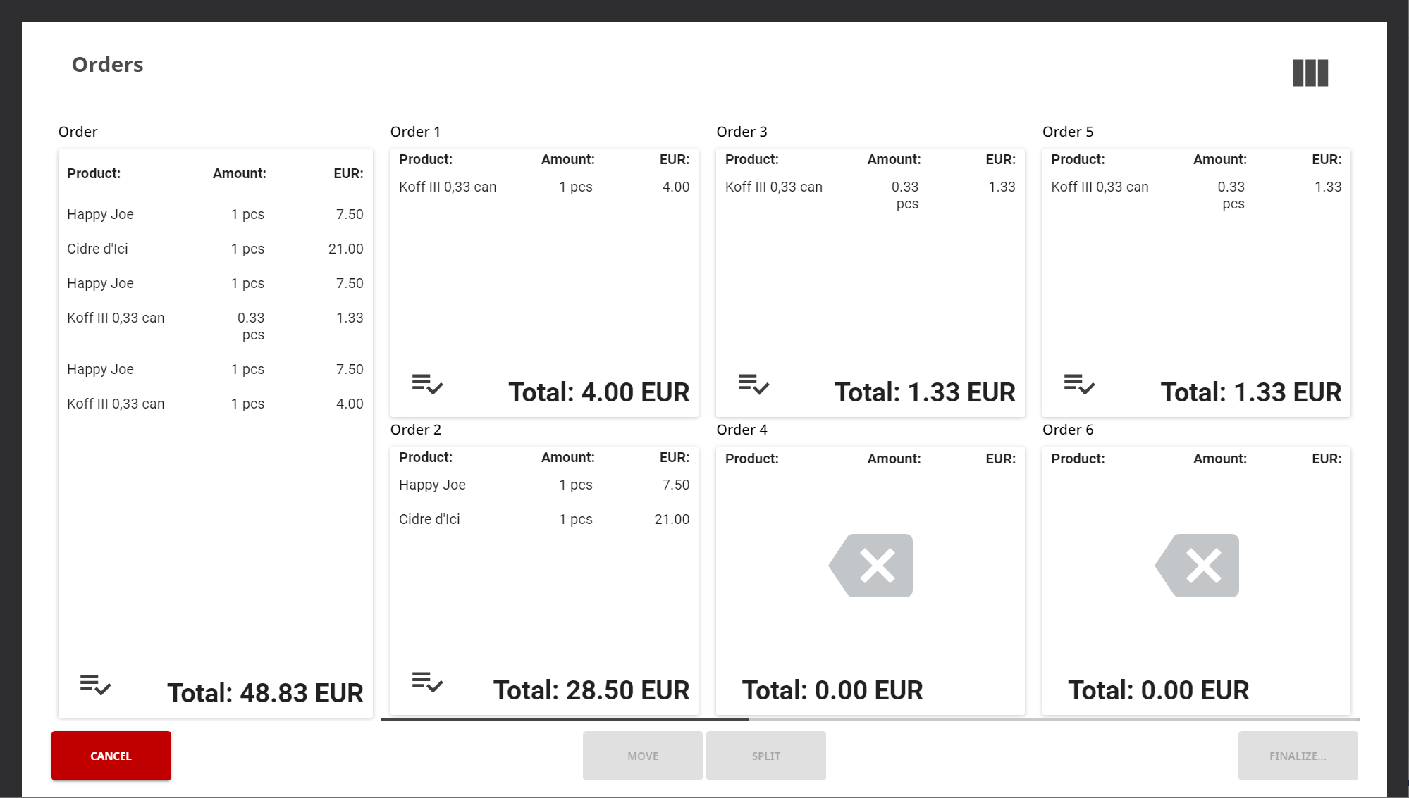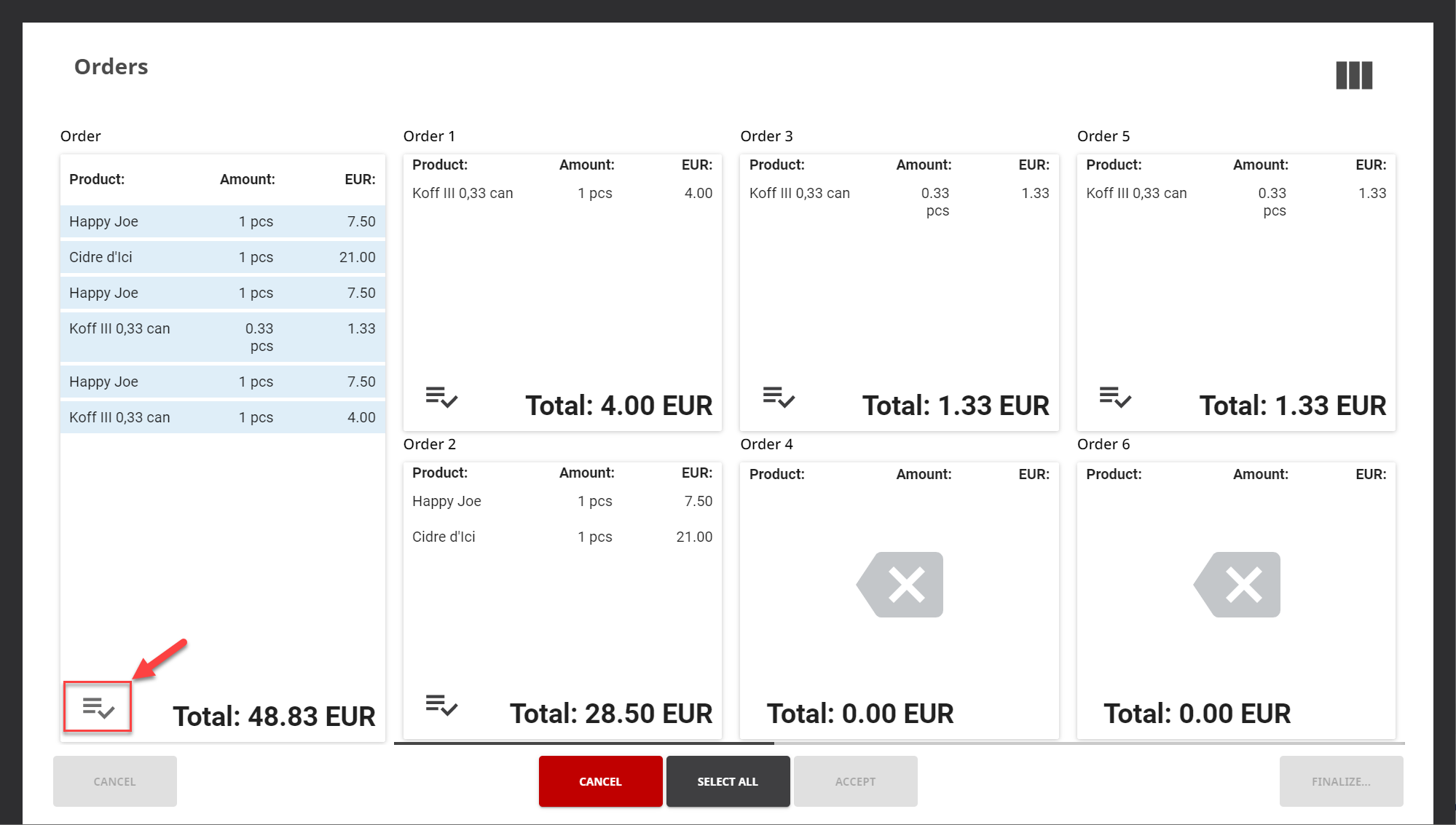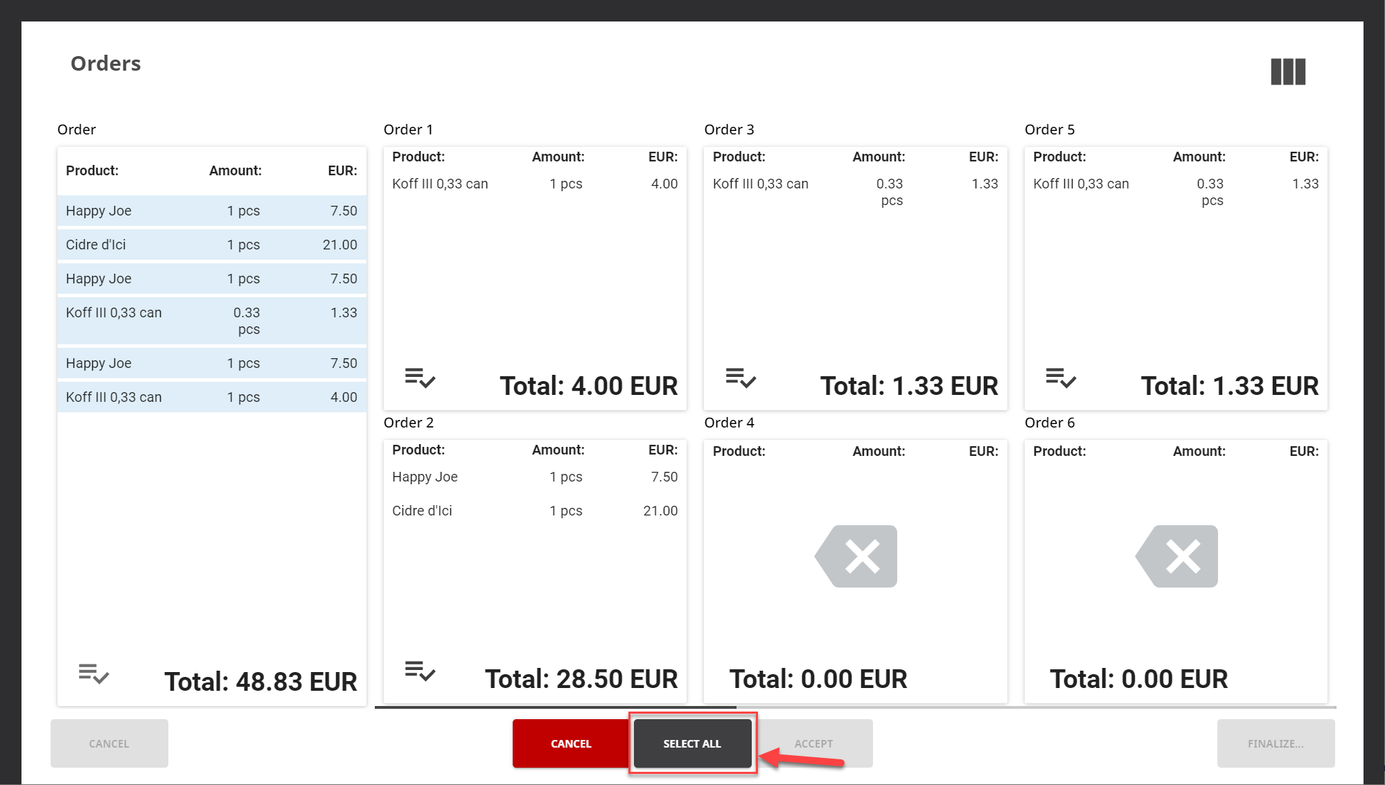 Voit jakaa valitut tuotteet tasaisesti kaikkien tilausten kesken painamalla Valitse kaikki -painiketta kuitin jakamisen yhteydessä.