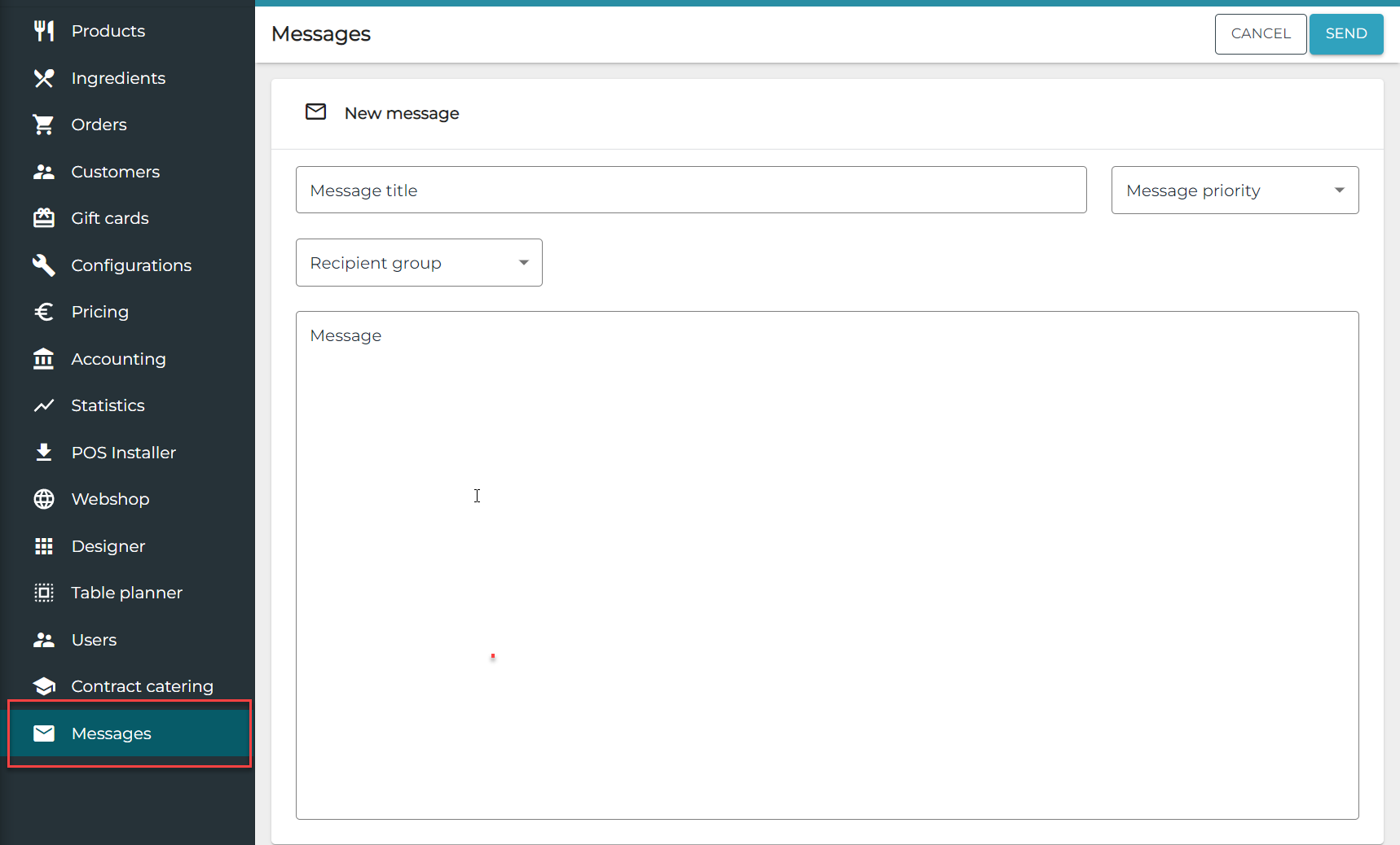 Kun käyttäjäryhmälläsi on tarvittavat käyttöoikeudet, Viestit-linkki tulee näkyviin taustapalvelun valikkoon. Klikkaa sitä avataksesi Uusi viesti -näkymän.