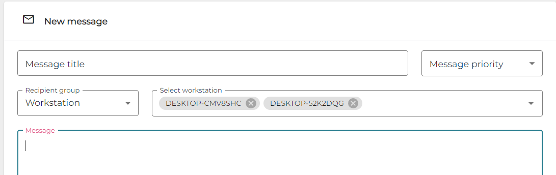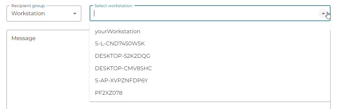 Työasema: Jos valitset tämän vaihtoehdon, tulee näkyviin toinen pudotusvalikko josta sinun tulee valita työasema(t) joihin viesti lähetetään.