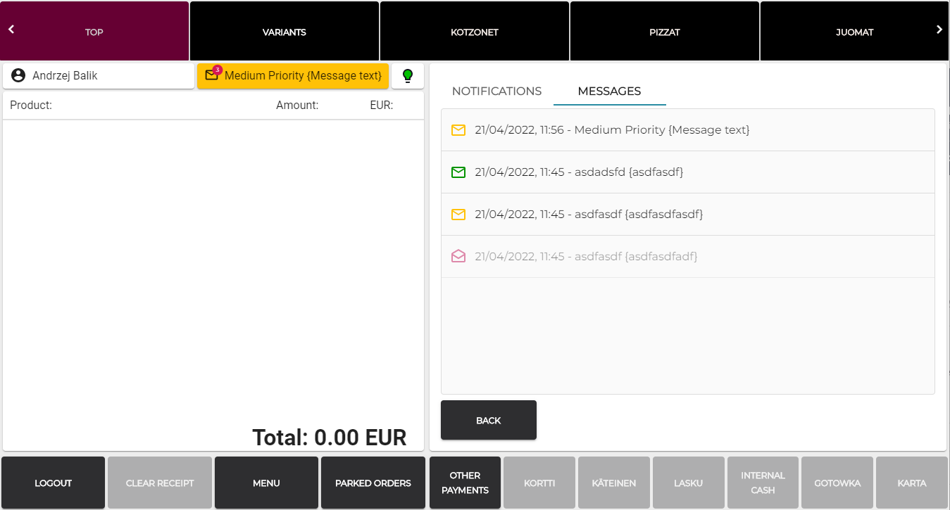 Jos työasema on viestin vastaanottajalistalla, viesti näytetään kassan ilmoitusalueella. Jos useampi kuin yksi viesti otetaan vastaan, viimeksi saapunut näkyy ensimmäisenä listalla. Laskuri näyttää montako lukematonta viestiä on vastaanotettu kassalla.