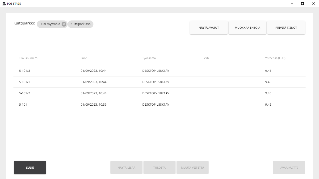 Kuitti jaetaan, ja kaikki luodut uudet kuitit menevät kuittiparkkiin. Kahden sekunnin viiveen jälkeen tulee näkyviin Tilaukset-näkymä, jossa kuitit ovat näkyvissä.