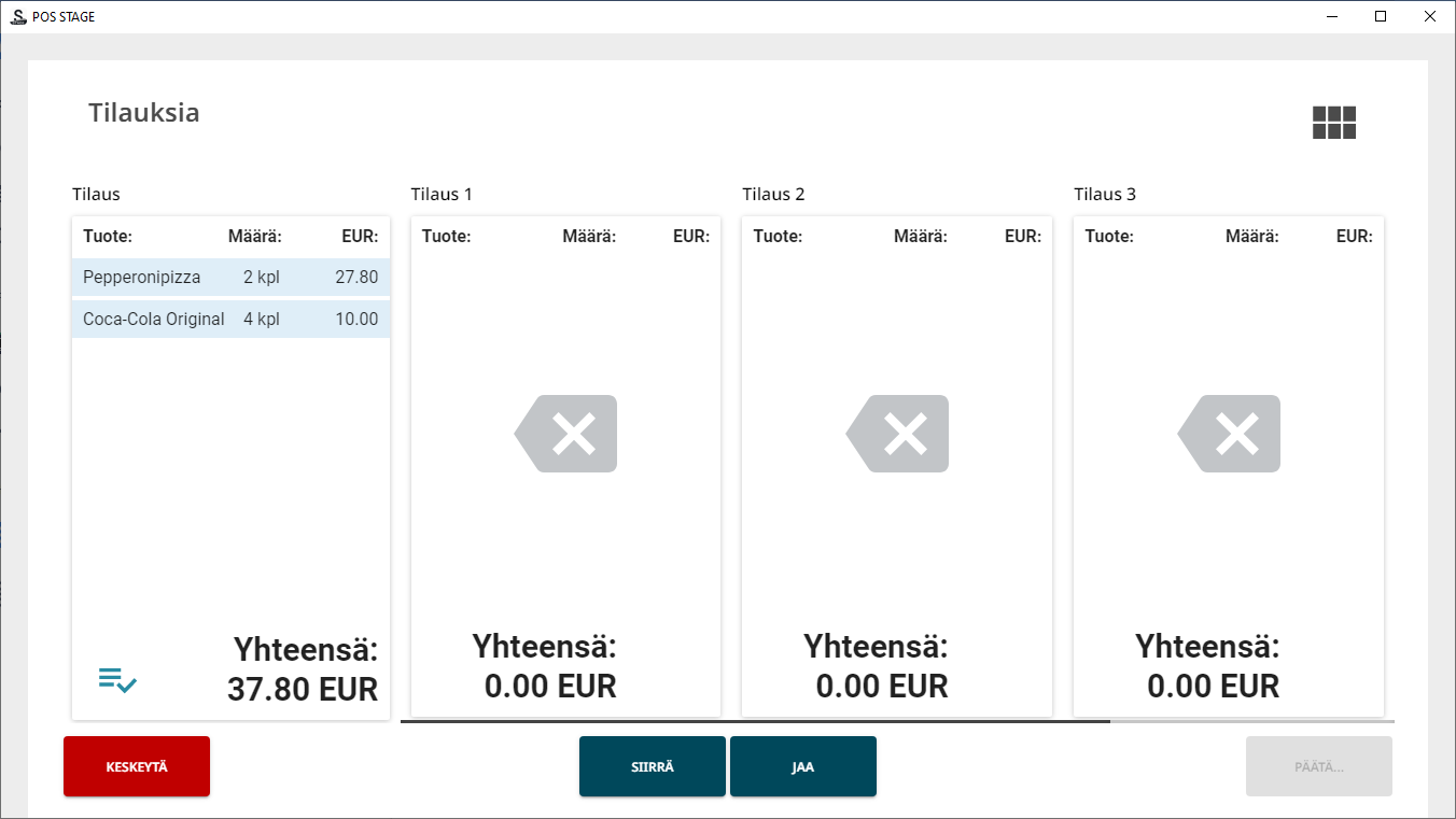 Tämä on hyödyllinen toiminto, kun ravintolassa käytetään maksun jakamista useampiin maksutapoihin, ja maksut lasketaan ennen päivän päättämistä.