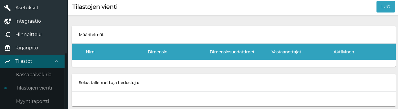 Klikkaa Tilastojen vienti -näkymässä Luo.