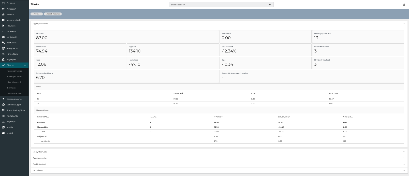 Solteq Commerce Cloudin Tilastot-näkymässä voit tarkastella reaaliaikaiseen myyntidataan perustuvia tilastoja sekä luoda raportteja. Näitä ovat: