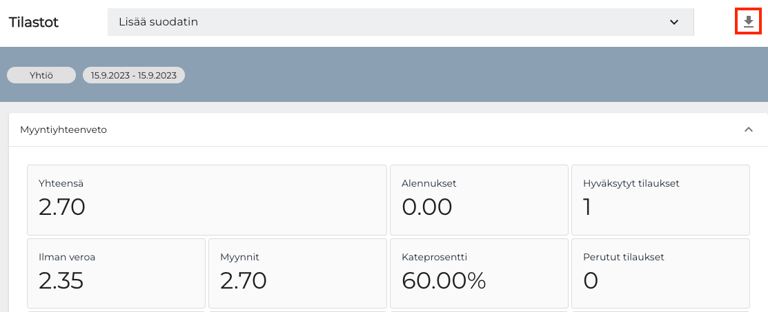 Kun avaat Tilastot-näkymän, näkyviin tulee oletusarvoisesti koko yrityksen myynti kuluvalta päivältä.