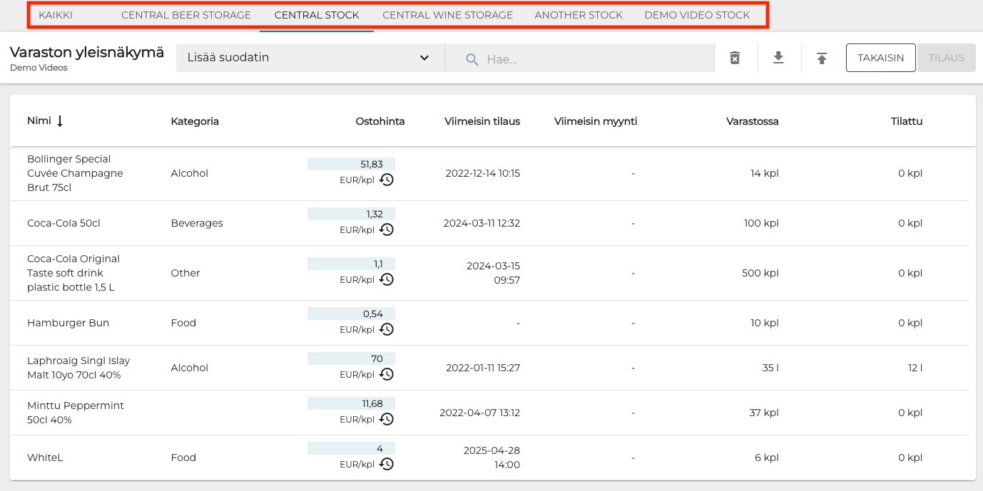 Mikäli valitsemaasi varastoa ei ole kohdennettu millekään tietylle myymälälle (eli se toimii keskusvarastona), voit vaihtaa varastonäkymää tai tarkastella kaikkien varastojen tietoja valitsemalla toisen välilehden Varaston yleisnäkymässä.