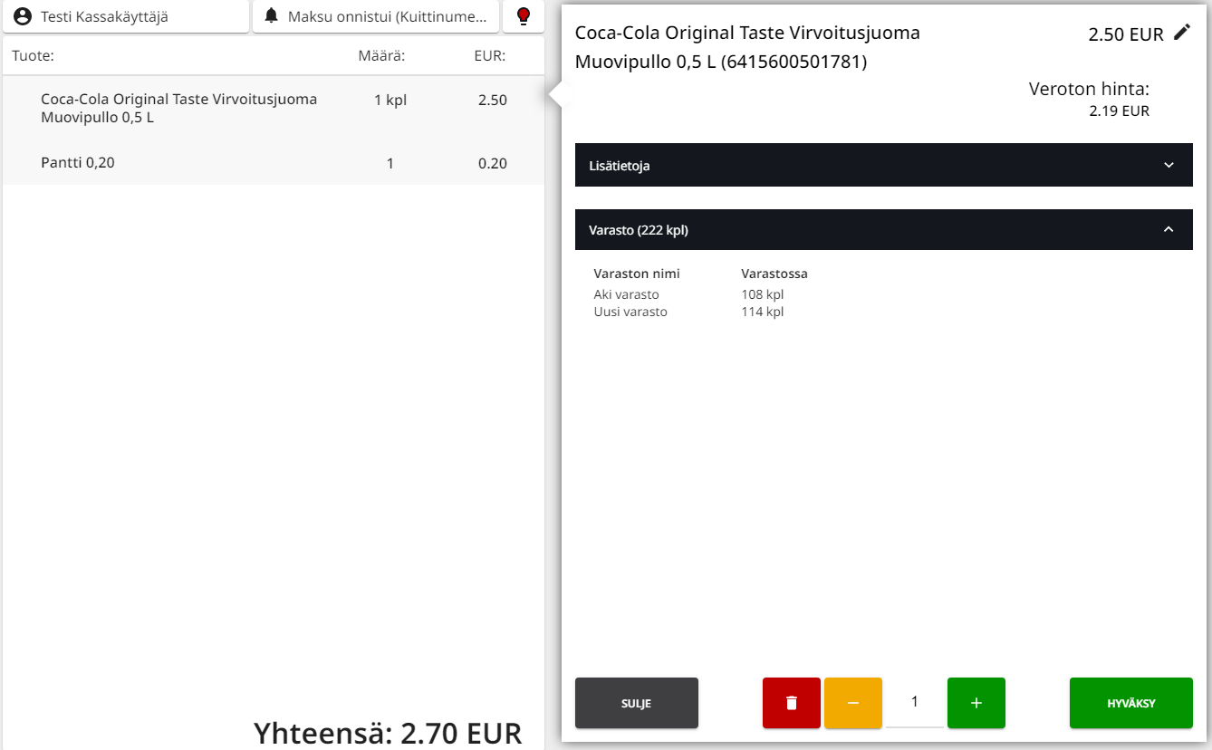 Tuotteen varastosaldot kassan näkymässä