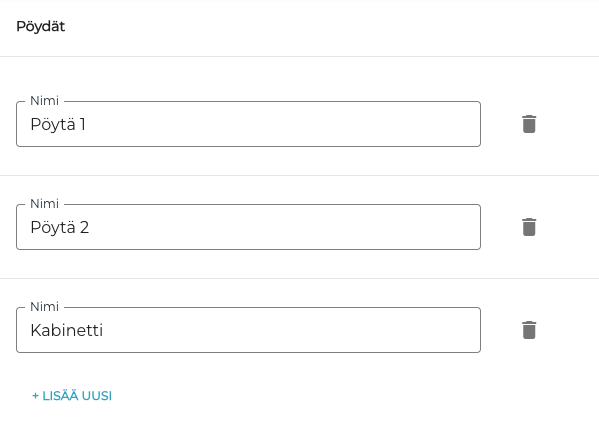 2. Lisää pöytiä klikkaamalla +Lisää uusi ja syöttämällä nimi jokaiselle lisättävälle pöydälle.