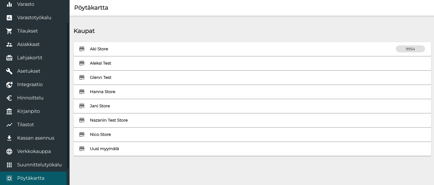 Jokaisella yrityksen myymälällä, jolla kyseinen toiminto on otettu käyttöön, on oma pöytäkarttansa; klikkaamalla taustapalvelun valikosta Pöytäkartta saat näkyviin listan myymälöistä, joilla on pöytäkartta käytössä.