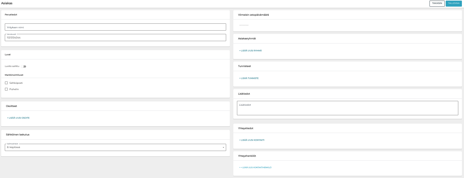 Tallenna lopuksi tiedot ja poistu näkymästä klikkaamalla Tallenna. Uusi yritysasiakas on nyt lisätty taustapalveluun.