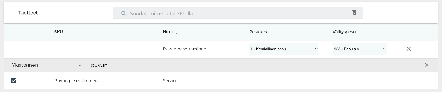Lisää tuote välityspesulalle klikkaamalla sen valintaruutua. Tuotteelle tulevat seuraavat tiedot näkyviin: