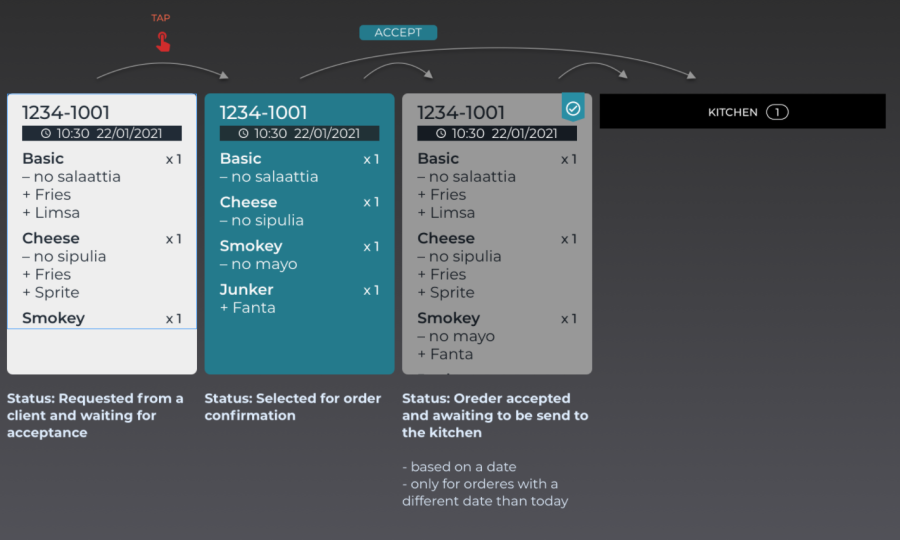 Asiakas saa kuittauksen, että keittiö on hyväksynyt tilauksen.