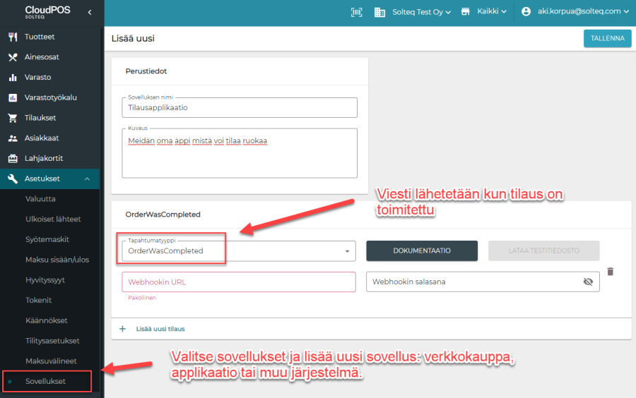 Jotta voidaan kommunikoida suoraan tilauksen tilaa kuluttajalle, taustalla voidaan myös määritellä sovelluksia. Näille sovelluksille voidaan lähettää Webhook tekniikkaa käyttäen viesti kun tilauksen tila muuttuu.
