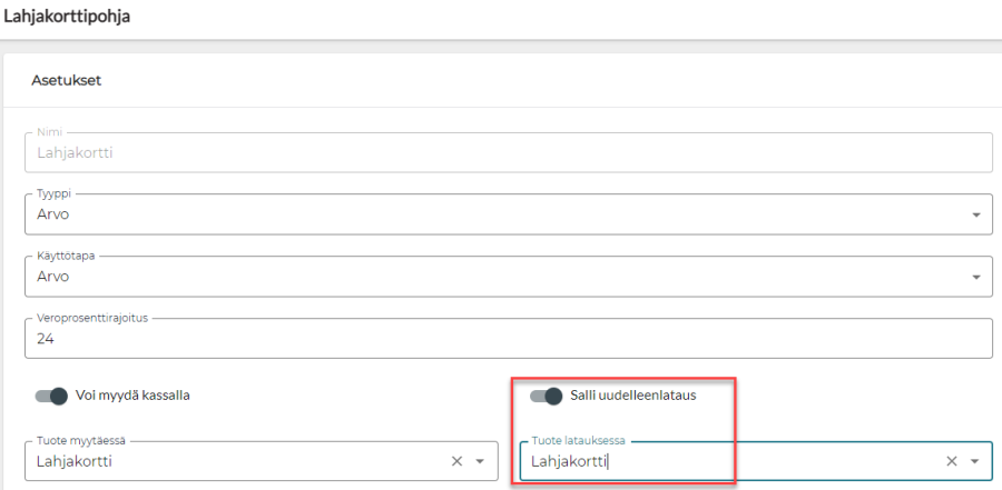 Jatkossa on mahdollista määritellä lahjakortin pohjan taakse "salli uudelleenlataus". Voit määritellä joko saman tai eri tuotteen kirjanpitoa varten uudelleen latauksille.