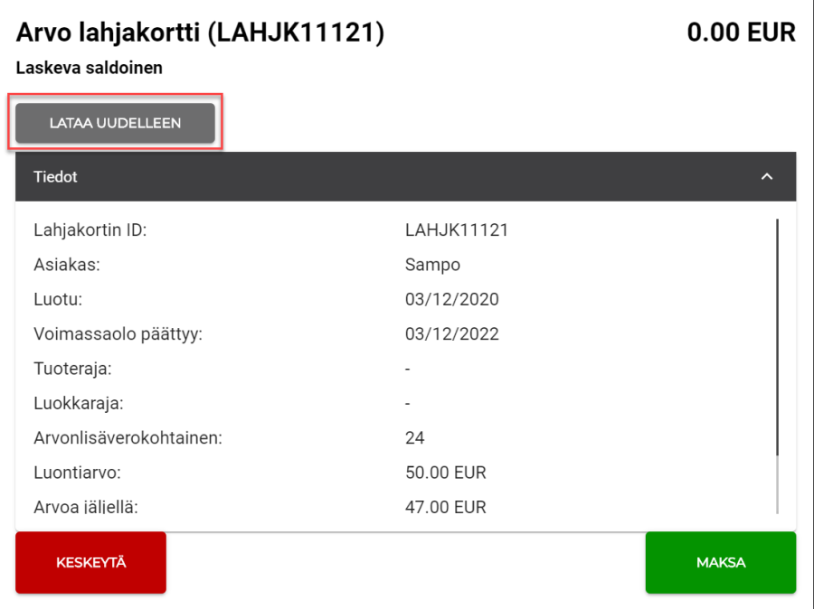 Lahjakortin uudelleen lataus