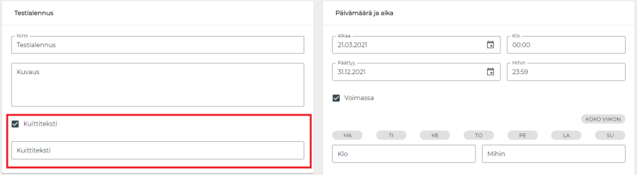 Kampanjoille voidaan asettaa kampanjakohtaisia kuittitekstejä. Kuittiteksti tulostuu kuitille, mikäli kuitilla on kampanjan mukainen alennus. Kampanjan asetuksista on asetettava päälle "Kuittiteksti"-valinta, minkä jälkeen voidaan "Kuittiteksti"-kenttään kirjoittaa haluttu kuittiteksti.