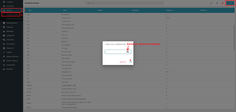 Kun uniikki viivakoodi on annettu, ohjelma generoi uuden tuotteen, jonka varastotunnukseksi tulee juuri syötetty viivakoodi. Uudelle tuotteelle syötetään nimi, kategoria, varastoyksikkö, verollinen ostohinta ja veroprosentti. Mikäli tuotetta luotaessa halutaan syöttää esimerkiksi tuotteen koko, voidaan lisätä uusi, sopiva varastoyksikkö. Kun tuotteelle on syötetty kaikki tiedot, painetaan tallenna.