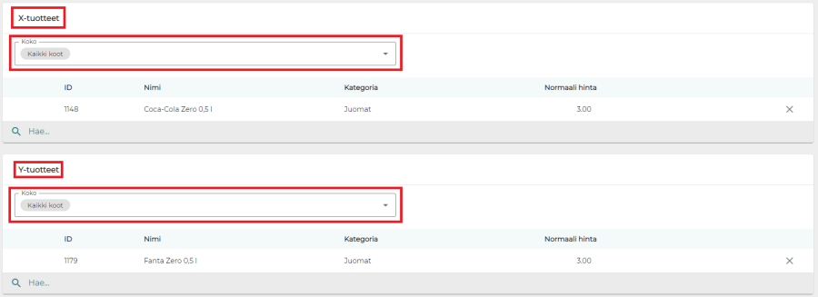 Tämän jälkeen voidaan valita, onko alennus prosenttiperusteinen vai muutettu hinta. Kun nämä on valittu, syötetään X-tuotteet ja Y-tuotteet. X-tuotteita ovat ne tuotteet, jotka on ostettava normaalihintaan. Näiden yhteydessä voidaan esimerkiksi reseptituotteesta valita, mitä kokoja kampanja koskee. Y-tuotteita ovat ne tuotteet, jotka myydään muuhun kuin normaalihintaan silloin, kun X-tuotteet on lisätty kuitille. Esimerkissä X-tuotteena on Coca-Cola Zero 0,5 l ja Y-tuotteena Fanta Zero 0,5 l, josta tulee alennusta 50 %.