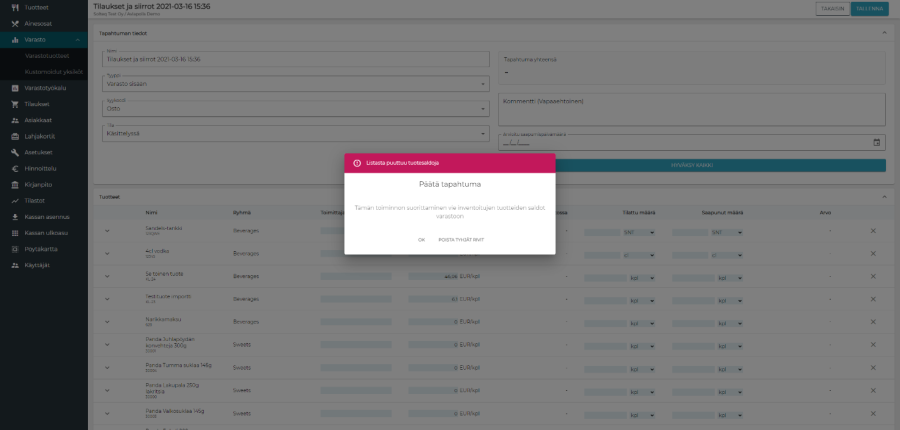 Kun ostotilauksessa painetaan "Hyväksy kaikki", taustaohjelma tarkistaa, onko ostotilauksella rivejä, joille ei ole syötetty arvoa. Mikäli näitä löytyy, ohjelma antaa virheilmoituksen "Listasta puuttuu tuotesaldoja". Virheilmoitukseen on mahdollista valita "Ok" tai "Poista tyhjät rivit". Mikäli valitaan "Ok", ohjelma palaa ostotilauksen luontinäkymään ja tyhjät rivit voidaan etsiä ja niille syöttää arvo. Mikäli valitaan "Poista tyhjät rivit", ohjelma poistaa ostotilaukselta ne tuotteet, joille ei olla syötetty arvoja. Sen jälkeen ostotilaus voidaan hyväksyä normaalisti.